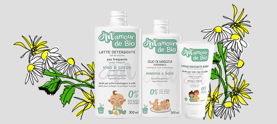 I cosmetici della linea M’amour de Bio sono tutti prodotti con estratti completamente naturali nel rispetto delle caratteristiche fisiologiche della delicata pelle del neonato. L’aggiunta di principi attivi presenti naturalmente negli ingredienti arricchisce la pelle, grazie alla loro specifica azione emolliente, lenitiva, detergente, disinfiammante e idratante.